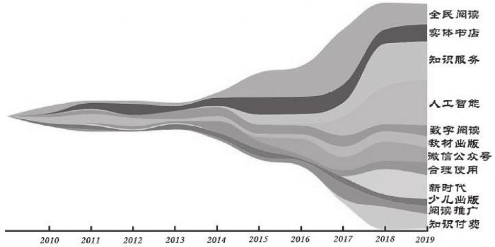 从前文已经获得的“关键词-时间演化表”截取总频次前10的热点关键词,制作热点关键词年度堆积面积图(见图4)。高频关键词的时间演化在相当程度上反映了产业嬗变的状况。词频最高的关键词“出版业”,体现了这种映射关系。2008年,国家新闻出版署为出版业改制明确列出了时间表和路线图。至2010年底,全国580家出版社转企改制全面完成,因此,关于出版业的探讨在2010年热度最高,而后逐渐转向其他方面的多元探讨,整体频次下降较快。但是,并非所有关键词的变化与产业发展完全同步,有的有一定的滞后性。以关键词“数字出版”为例,依据国家新闻出版署发布的历年《新闻出版产业分析报告》,2012年产业增长率达到峰值,而后逐年下滑。而数字出版相关研究虽然在发展曲线上与产业增长率大致相同,于2013、2014年达到峰值,在时间维度上稍滞后于产业发展的热度。