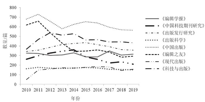 2010—2019年中国知网数据库收录的8种编辑出版学科期刊共发文27 214篇。在一定程度上,期刊论文载文量反映了该学科的研究热度(图1)。编辑出版类论文数量于2011年达到最大,有3 160篇,随后稍有回落并在近些年逐步稳定在每年2 800篇左右,表明关于该领域的研究逐渐成熟,步入了稳定期。其中大部分期刊在这10年间的载文量是相对稳定的,但也有个别期刊有不同表现。如《中国出版》从2010年改为半月刊后,在开始两年载文量较多,而自2013年后逐步稳定在每年600篇左右;而《编辑之友》近年来因将其定位于“精品力作出版新高地”后,其发文量从2011年的600余篇逐年收紧至现在的200余篇。另外值得注意的是,科技的飞速发展给编辑出版学科及其产业带来深刻变革,因此,对新媒体、新科技等相关研究也引起较多关注,这可能正是《科技与出版》载文量阶段性上升的原因之一。