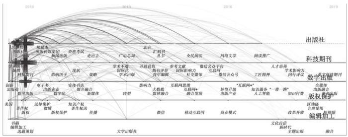 对这些研究热点进一步分析发现,编辑出版领域研究热点为出版/数字出版、编辑、出版社、文化机构、出版业、新媒体、创新等方面,研究较多的出版物种类有科技期刊、学术期刊、图书等,这表明出版物类型中期刊的研究受到重视,形成了一系列高频关键词,如科技期刊、学术期刊、期刊、医学期刊、高校学报等。随着科技的飞速发展,围绕着数字出版、新媒体、媒体融合、数字化、大数据、媒介融合等的研究越来越受到重视。研究人员对出版活动的各要素,出版、出版业、出版社、编辑保持了较高的关注度。随着经济发展和观念转变,版权、著作权等版权保护内容开始受到重视。值得注意的是,近年的国家社会科学基金申报指南将“双一流学科建设背景下我国编辑出版学的发展与培育研究”列入条目,这将在一定程度上影响编辑出版领域的未来发展。