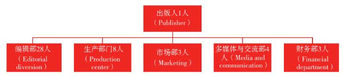 与庞大的科学家编辑队伍相反,PNAS编辑部本身却是精兵简政,机构人员分工清晰明确。美国科学院院刊有1名出版人(Publisher),负责整个院刊5个部门(编辑部、生产部、市场部、多媒体与交流部和财务部)的编辑工作、加工排版工作以及出版发行工作(见图2)。