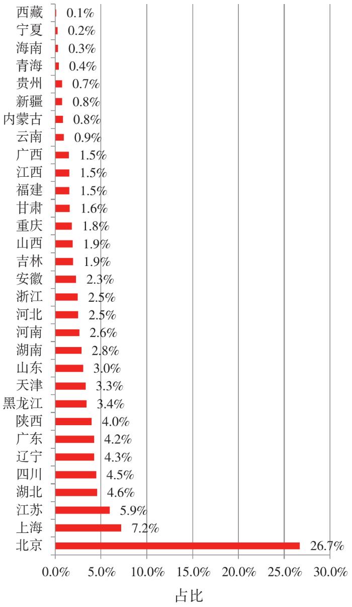从地域分布上看,拥有中文科技期刊最多的10个省市分别为北京、上海、江苏、湖北、四川、辽宁、广东、陕西、黑龙江、天津,如图1所示。其中,排在第一位的北京遥遥领先于其他省市,占比26.7%。作为首都,北京是中国政治、文化、科技创新的中心城市,汇聚了众多科研能力与经济实力雄厚的高校、科研院所、一级学会、央企以及出版机构等,这些期刊主办单位为期刊的发展奠定了坚实的基础。拥有期刊数量排在第二位与第三位的分别是上海(占比7.2%)与江苏(占比5.9%),这两个地区兼具科技实力和经济实力,可以保障众多期刊的出版与运营。