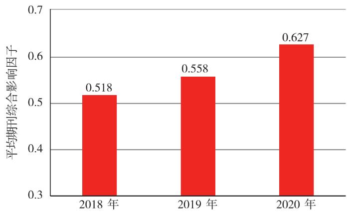 综合影响因子与综合总被引频次是《年报》中评价期刊影响力的2个重要指标。综合影响因子(MS-JIF)是指某期刊前2年发表的可被引文献在统计年被综合统计源引用的总次数,与该期刊在前2年内发表的可被引文献总量之比[7]。综合总被引频次是指某期刊自创刊以来发表的全部可被引文献,在统计年被综合统计源引用的总次数[7]。2018—2020年我国中文科技期刊的平均期刊综合影响因子与平均期刊综合总被引频次情况如图5与图6所示。图中可见,3年来我国中文科技期刊的平均综合影响因子与平均综合总被引频次均逐年上升。2018—2020年,我国中文科技期刊的平均综合影响因子分别为0.518、0.558、0.627,平均期刊综合总被引频次分别为1 196、1 222、1 277。与2019年相比,2020年我国中文科技期刊的平均综合影响因子增长了12.4%,平均综合总被引频次增长了4.5%。我国中文科技期刊在可被引文献保持稳定的情况下,平均综合影响因子与平均总被引频次均逐年上升,说明期刊出版的文章质量得到不断提升,因而期刊的影响力与关注度逐年增加。