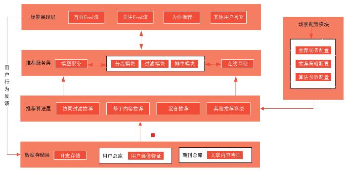 (1)场景展现层:即用户交互层,负责给用户展示推荐结果并与用户交互。在网站网页或者APP页面,根据期刊业务要求分成不同的推荐场景,以Feed流形式展现,依据具体期刊业务要求而定。网站或者移动APP终端将用户的各种各样行为记录到用户行为日志中,采集到的日志数据经过算法系统的计算,可以得到用户的偏好或者个性化兴趣,这些个性化数据又反过来进一步指导“展现内容”,使其更加完善。
