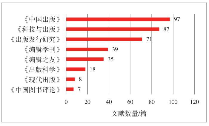 1998—2019年我国学术期刊中图书出版品牌研究相关文献载文量分布如图2所示,载文量大于7篇的期刊有8个,刊发了360余篇出版品牌方面的成果,凸显了品牌建设对出版行业发展的重要性。其中,《中国出版》载文量97篇居首位,其次是《科技与出版》(87篇)、《出版发行研究》(71篇),这3个期刊的载文量合计255篇,占文献总数量的68%,刊发了大部分图书出版品牌方面的论文。这些期刊是编辑出版领域的核心期刊,发表的成果代表了出版品牌研究的前沿动态。