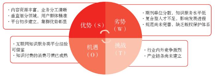 | 劣势(W) | 期刊单位分散,知识服务水平低 | 服务规范未完善,缺乏版权保护体系 | 复合型人才不足,影响发展进程 | — | |