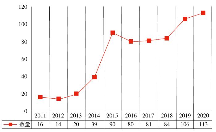 检索中国期刊全文数据库中2020年以“出版融合”为主题的“北大核心”和CSSCI来源期刊均收录的论文,经过去重、筛选等数据清洗环节后,共获得有效论文113篇,该值为2011—2020年相关论文发表数量最大值,如图1所示。由此可见,学界对于“出版融合”的关注度总体呈现递增趋势,并于2020年达到顶峰。该数据直接体现了“出版融合”理论研究的持续发展,同时在一定程度上间接反映了2020年出版融合产业实践的丰富性。