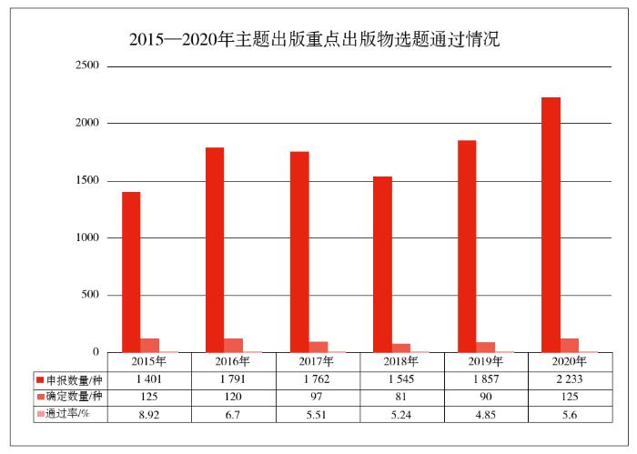 自“主题出版工程”实施以来,主题出版选题类型经历了由配合党和国家的工作主题主线、符合科学发展观的“基本研究”,向唱响主旋律、突出时代性的“上层建筑”变化,随着时间的推移,变化更加明确及清晰。近年来,新闻出版主管部门对主题出版工作给予了大幅度扶持,各地也加强了对图书资源的整合。表1是近几年主题出版物选题的相关情况,从选题通过率可以发现,主题出版物的选题稳定发展,变化有序。[2]