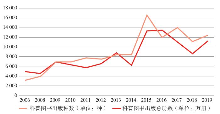 进入21世纪以来,我国科普事业伴随着经济社会的快速发展取得了长足进步,科普图书出版也迎来快速发展时期,图书种类明显增多,发行量显著增加,出版市场整体发展较快。从2006—2019年我国科普图书出版数据来看(见图1),以2015年为分界点,2015年以前的科普图书出版种类和出版数量呈平缓上升趋势。2015年是我国科普图书出版迅速发展的一年,出版种数和发行数量均为历年之最,其占当年出版图书总数和总发行量的比例也是近些年来最高[3]。统计数据显示,2015年全国共出版科普图书16 600种,比2014年增加了8 093种,几乎翻了一倍,首次突破1万种,占同年全国共出版图书种数的3.49%;印刷册数为1.34亿册,首次突破亿册大关,占同年全国出版图书总印册数的1.54%[4]。随后,网络化科普传媒快速发展,纸质出版物普遍受到冲击和影响,科普图书的出版种数和出版册数均有所下降,到2019年图书发行开始逐渐回升。同时,新媒体的影响力日益增大,微信、微博、移动客户端等新媒体科普传播增长迅速,网络化科普传播手段应用更加广泛[5]。