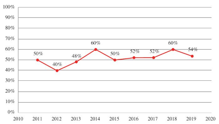 从获评“全国优秀科普作品”科普图书的作者职业来看,2011—2019年总计450本获奖作品中有237本的作者为科学家,占比52.7%,从年度获奖趋势来看,科学家作品的获奖比例也稳定在50%左右(见图2)。尽管在科普创作整体队伍中科学家群体的占比不大,但科学家作品的质量和水平都获得了较好的肯定。