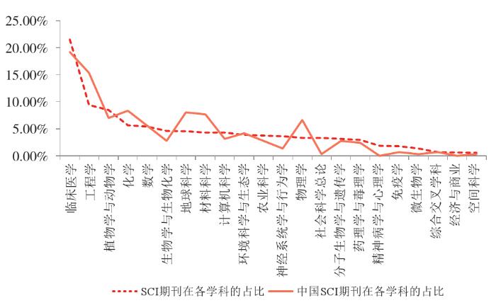 基本科学指标数据库(Essential Science Indicators,简称ESI),是对科研机构、科研人员以及国家和地区科研能力的重要评价工具之一。ESI调查了来自世界各地的11 000多份期刊,按照学科分类体系将它们分成22个大类。由于SCIE收录的期刊范围与ESI收录的期刊范围略有差别,SCIE收录的期刊中有55种期刊未被ESI收录,但由于整体数量较少,暂时不考虑这些期刊对整体趋势造成的影响。根据ESI数据库划分的22个学科类别,图2显示了所有SCIE期刊以及中国SCIE期刊在各个学科的占比情况。由图可以看出,中国在临床医学、工程学、化学的期刊数量是最多的,分别占到中国期刊总数的19%、15%和8%,但是跟SCIE收录的所有高质量期刊相比,我国在工程学、化学、地球科学、材料科学和物理学这五类学科上的期刊数量是最有优势的,大大超过了平均水平。当然在临床医学、植物学与动物学、生物学与生物化学、神经系统学与行为学这四类学科上的期刊数量和质量与其他国家相比还有待提高。