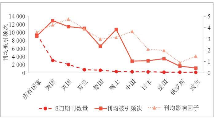 本文统计了SCIE收录的所有期刊以及来源较多的10个国家的期刊数量、刊均被引频次和刊均影响因子指标,如图3所示。刊均被引频次的整体变化趋势跟期刊数量的走势大致相同,只有瑞士表现得格外出色。而中国的刊均被引频次表现较差,远低于美国、英国、荷兰、德国和瑞士,甚至低于排名靠后的日本和法国;与所有SCIE期刊的平均值比也低了很多。从刊均影响因子上看,中国的期刊虽然低于美国、英国和荷兰,但是比德国、瑞士等其他国家要高一些,与所有期刊的平均值相当。