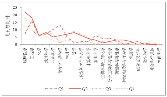 中国的286个期刊共分布在20个学科中,其中植物学与动物学、材料科学、农业科学优质期刊的比重远高于其他学科,可见这些期刊在业界已经得到了认可,对学科发展也起到了积极的促进作用,在影响力和学科发展互相促进的情况下,有能力形成一批具有国际话语权的权威期刊。而临床医学、数学、计算机科学、神经系统学与行为学的期刊则相反,Q1区的占比很小,而Q2、Q3、Q4区的占比很大,所以优质期刊的数量较少,大量的是达到了SCIE收录标准但影响力还较小的期刊,这些领域的期刊已经崭露头角,发展潜力非常大。按照期刊分区统计,中国SCIE期刊在ESI学科上的分布情况如图4所示。