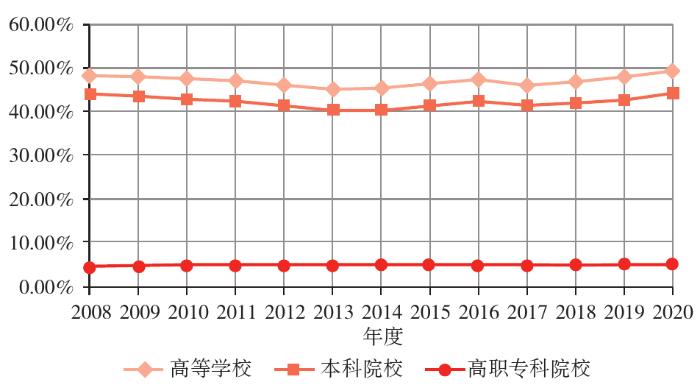 | 年度 | 所有单位 | 高等学校 | 高职专科 | 本科院校 | ||||