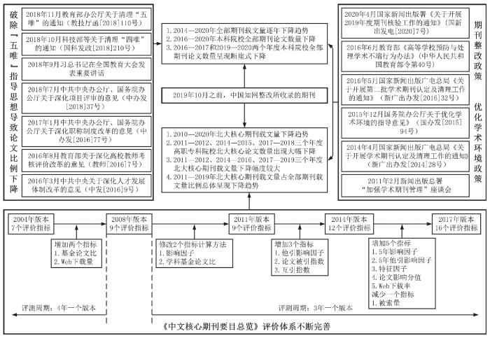 本文统计并分析了2008—2020年中国知网收录的中文学术期刊、北大核心期刊论文数量及其变化趋势,认为《总览》评价体系不断完善,期刊整改加强了对期刊的监测评估,优化学术环境加强了对高校师生的规范指导,破除“五唯”指导思想导致论文比例下降,这四个维度是论文数量下降的主要原因。本文得出以下研究结论:这四个维度导致中文学术期刊论文数量逐年减少,其中《总览》评价体系不断完善是高职专科院校北大核心论文数量减少的主要成因,破除“五唯”指导思想是导致本科院校期刊论文数量在2016—2017年和2019—2020年呈现两次断崖式下降的主要成因。