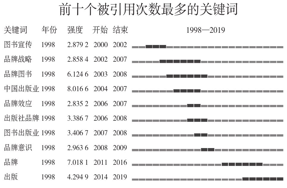 1998—2019年我国图书出版品牌研究关键词突显知识图谱