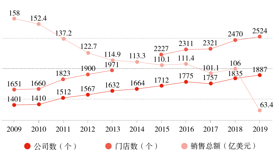 2009年至2019年美国实体书店的公司数量、门店数量与销售总额变化