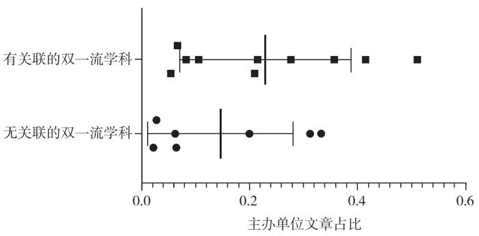 高起点新刊的主办单位以高校为主,占主办单位类型的50%,其他依次为学会占19%、科研院所占17%、出版社占14%;大多数机构只主办1~2种出版物,主办单位较为分散。中国科技出版传媒股份有限公司入选期刊最多,共10种;其次是中华医学会,有9种期刊。我们对高校与新刊间的关系进行分析后发现,在45种由高校主办的期刊中,32种期刊有与之相关联的双一流学科(占比71.1%)。一流学科与高起点新刊研究方向之间不是简单的包含与被包含的关系,高起点新刊研究方向明确且细分,瞄准学科前沿,一般会存在学科交叉,这就使得期刊的研究方向贴近于双一流学科与其他学科领域的交集。进一步分析期刊与高校双一流学科间的关系,受数据可获得性的限制,仅分析了被DOAJ收录期刊的总载文量和本机构载文量之间的关系。结果如图1所示,有关联双一流学科的期刊,其主办单位发表的文章占比均值要高于没有关联双一流学科的期刊,不过这一关系并不显著。此外,我们还发现期刊载文量与主办单位文章占比之间存在不显著的负向关系(spearman相关系数-0.42,P=0.228),本机构文章一般来源于同一院系(实验室)。以上结果说明主办单位文章在期刊创刊初期具有重要意义,随着稿源增加,逐渐稀释了主办单位文章的占比,因此产生负向关系。但是有关联双一流学科的供稿占比更高仍然体现了学科建设对期刊的支持作用,结果呈现不显著可能与研究中数据量较少有关,该结果仍需要后续数据进一步验证。