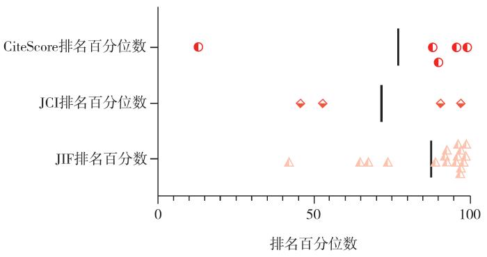 我们统计了JCR和Scopus收录的高起点新刊2021年的引证指标,并转化为百分位数,被SCI/SSCI索引的期刊使用影响因子(JIF)排名百分位数,被ESCI索引的期刊使用期刊引文指标(JCI)排名百分位数,其余期刊如果被Scopus索引,则使用CiteScore排名百分位数。结果如图2所示,共检索到26种期刊的引证指标,竖线代表平均值,可以看出高起点新刊普遍具有较高的排名。Regenerative Biomaterials获得了最高影响因子,为24.8。有3种期刊在同领域影响因子排名第1,12种期刊影响因子在同领域中排名前10%。