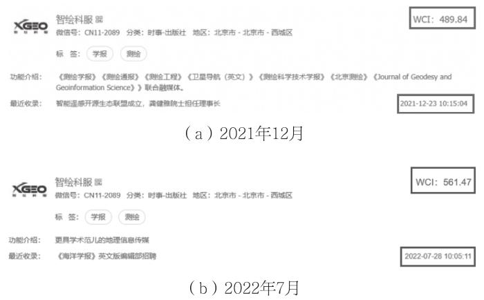 微信传播指数WCI可利用总阅读数、平均阅读数、最高阅读数、总点赞数、平均点赞数和最高点赞数六个指标对微信公众号进行整体评估。本文利用微信传播指数WCI-清博指数对微信公众号“智绘科服”2021年12月和2022年7月的整体热度和发展走势做了对比,如图1所示。