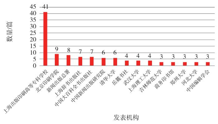 318篇文献的发表机构共193个。绝大多数机构发表1~2篇文献,发表3篇以上的机构如图1所示,其中发表文献最多的是上海出版印刷高等专科学校,为41篇。