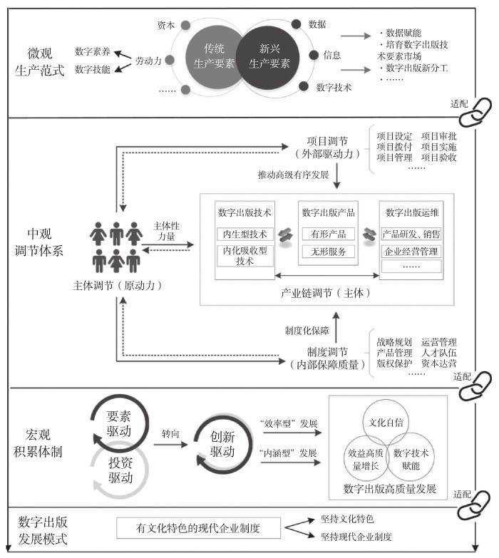 在微观方面,数字出版调节面临着新的生产范式,数字出版流程出现了新的技术和分工。除了资本等传统生产要素外,一方面,劳动力作为传统生产要素,须具备数字素养和技能,“培养数字化适应力、学习力、认知力和理解力和胜任力,需要拥有内容创新力、技术创新力、渠道创新力以及出版企业文化创新力等数字化创造力”[32]。另一方面,信息、数据和数字技术作为新兴生产要素,被纳入数字出版流程并持久发挥赋能作用。确立数据赋能理念,推动数据赋能,完善数据建设流程,推进数据治理,成为数字出版发展的必然趋势;依靠出版科技创新动力,培育数字出版技术要素市场,建立出版科技与标准协同创新体系,高度重视技术赋能价值,贯彻落实出版业数字化战略,成为数字出版发展的内在要求。伴随生产要素系统的革新,数字出版新的分工开始出现:区别于以往编校印发的分工模式,数字出版内容编辑、技术编辑和运维编辑成为相对固定的分工框架。
