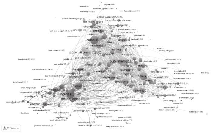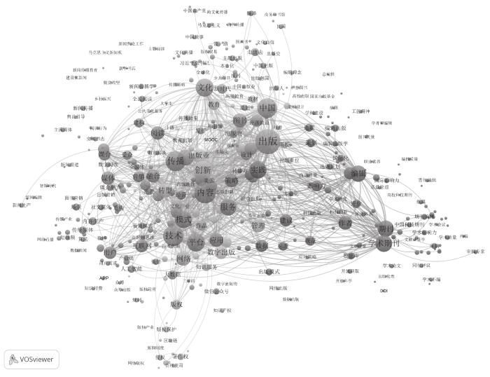 为探寻中国出版领域研究热点,本文选取《出版发行研究》《出版科学》《编辑学报》《编辑之友》《科技与出版》《现代出版》《中国编辑》《中国出版》等8种出版研究CSSCI来源期刊(按刊名音序排列),通过中国知网导出2015年1月到2021年10月这8种期刊所载文章的关键词、标题、摘要等文章信息,共获得条目17 168条,去除重复文献、公告、设计作品、新闻、讣告、答作者信后,剩余14 109篇文章用于关键词提取和分析。在使用COOC9.9对关键词频次进行统计后,选择出现频次在13次及以上的498个关键词生成关键词库,并使用与处理英文文献相同的方法,剩余440个关键词生成可视化图谱,如图2所示。