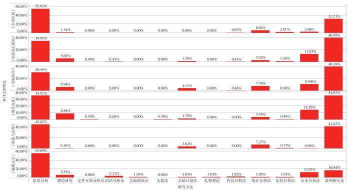 不同期刊由于选稿取向,或者办刊定位的不同,在研究方法的侧重上有可能存在差异。本研究分别统计了6种期刊的文献在研究方法方面的使用情况。如图2所示,《出版发行研究》和《出版科学》的文献更多地使用案例研究法进行研究,使用案例研究法的文献在其抽样样本中的占比分别为40.09%、40.18%。《科技与出版》《中国出版》《编辑之友》的文献更多地使用思辨分析进行研究,使用思辨分析的文献在其抽样样本中的占比分别为45.82%、55.03%和55.69%。《现代出版》较为平衡案例研究法和思辨分析的文献数量,使用两者的文献在其抽样样本中的占比均为35%。
