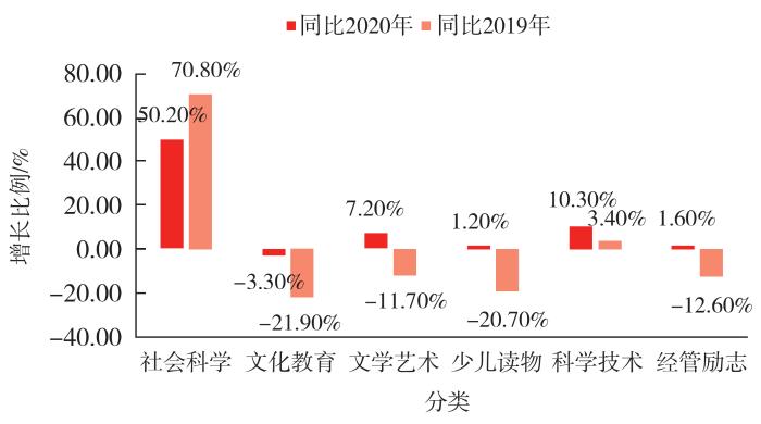 2021年是中国书业市场非同寻常的一年。商报·奥示数据研析组发布的《2021年全国图书零售同比双增》显示[3],我国2021年图书零售市场的销售结构是:社会科学图书份额最大,占比26.98%,同比增长3.61%;文化教育类图书份额次之,占比25.62%,同比增长0.96%;少儿读物份额居中,占比24.20%,同比减少4.23%;文学艺术类图书份额第四,占比16.35%,同比降低0.51%;科学技术类图书份额居末,占比6.85%,同比增长0.17%。相较于上一年度,2021年社科、文教、科技3类图书细分市场比重上升,少儿、文艺两类图书细分市场比重下降,而这正与各细分市场的销售同比走势吻合,社科、文教、科技类图书销售分别同比增长15.74%、4.12%、2.80%,少儿读物、文艺类图书销售分别同比降低14.65%、2.79%。2021年疫情防控常态化后,抗疫类图书的热度大幅下降,同时受“双减”政策影响,中小学教辅类热度有所下降。