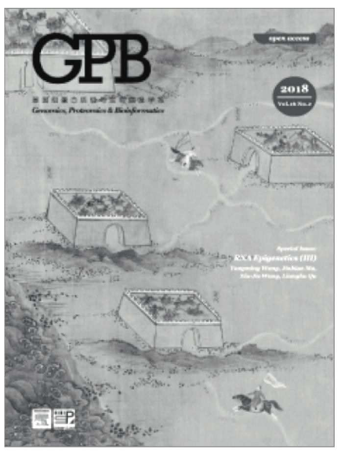 我国清末思想家严复在其《天演论》中提到:“译事三难:信、达、雅。”我们也可以将其应用到封面设计中,“信”代表形式尊重内容,视觉设计要忠实期刊和文章的真实含义;“达”是指以形表意,封面设计要让读者顺畅、准确地理解期刊的定位以及本期封面文章的主题;“雅”表示封面设计要有艺术性,追求设计的“文采”。期刊封面通过平面艺术、绘画艺术、摄影艺术等视觉表达手法,运用线条、形状、色彩、明暗、材质、空间等设计基本元素,以平衡、对比、统一、协调、节奏等设计原则,达到内容与形式的统一,向目标受众传达一定的意义,使读者高度理解主题的同时,感受到了真善美的意境。比如,《基因组蛋白质组与生物信息学报》(英文版)(见图10)借我国明代描绘丝路地理信息的青绿山水手卷《丝路山水地图》中的三座城池,比喻期刊连载的三篇重要的《RNA表观遗传学》文章。