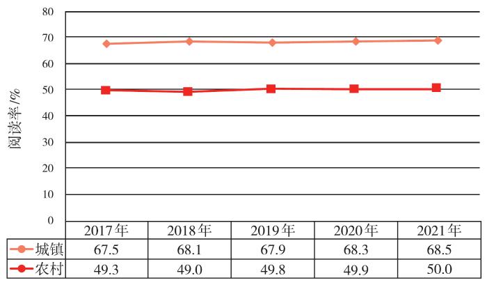 从近年全国国民阅读调查的数据来看,虽然城乡之间仍然存在一定的差距,但乡村阅读整体上呈增长态势。具体来看,近五年来我国乡村成年人的图书阅读率和阅读量持续稳定提升(见图1)。从全国国民阅读调查数据来看,2021年我国农村成年居民的图书阅读率为50.0%,较城镇成年居民的68.5%低18.5个百分点。虽然近五年来我国城乡成年居民之间的图书阅读率差距较大,但从农村居民图书阅读率发展趋势来看,一直保持着稳定增长的势头,农村成年居民的图书阅读率由2017年的49.3%,稳步增长至2021年的50.0%。