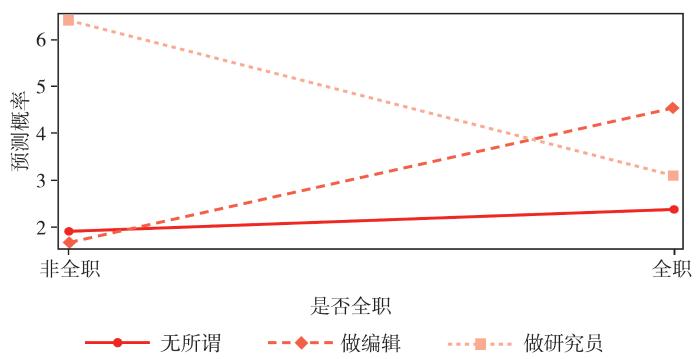 其次,全职编辑选择做研究员的相对风险比非全职编辑提升了6%。说明在考虑编辑同事数量的情况下,全职编辑的认同感会有一定程度的提升,假设1b得到支持。由图3可见,非全职编辑做研究员的预测概率明显高于全职编辑群体,而全职编辑预测为编辑的比例又高于非全职,而且存在一个对两种职业都不敏感的“无所谓”群体,预测概率在两类人群中均在0.2左右。