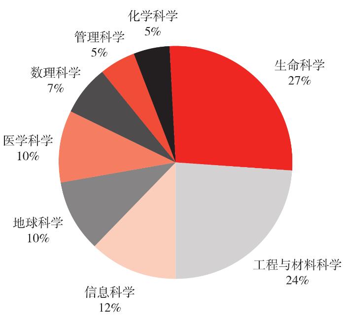 笔者对出版基金成立以来资助的2 858项著作按学科大类分类统计分析(如图2所示),发现生命科学领域获得资助最多,占比27%;其次为工程与材料科学,占比24%。这两个学科的项目数量超过了资助总数量的一半。