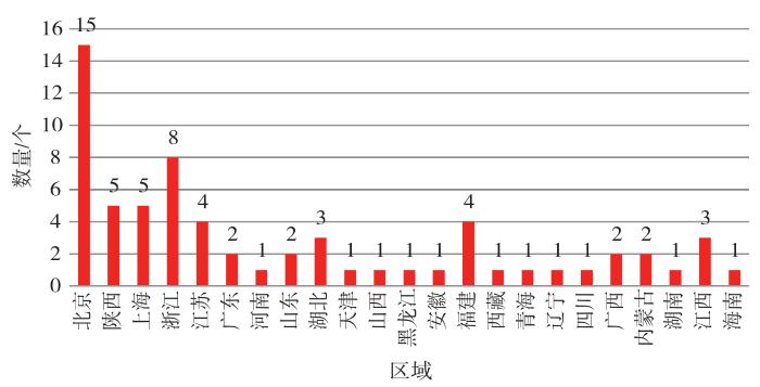 如图1所示,近五年获得“年度主题书店”荣誉的实体书店涵盖了我国23个省、自治区与直辖市,北京市以15家居于榜首,这与《2020—2021中国实体书店产业报告》中显示的北京在2020年以639家新开书店数量位列第一的发展趋势相一致。从书店的定位来看,北京实体书店在多样性呈现上更具优势,既有关注特殊群体的善缘书舍生命主题书店和少数民族的团结书社,又有聚焦于某一小众领域选品的艺术书店,如以音乐为主的MPK黑胶书店、关照女性的雨枫书馆·清华馆、以古今中外地图元素为装饰的地图主题书店、聚焦摄影活动的像素书店等。浙江省以8家书店位居第二,值得注意的是,这些书店并不只是聚集于省会城市杭州(3家),还见于宁波(3家)、丽水(1家)、温州(1家)等城市。作为社会主义新农村发展的代表,浙江的实体书店更多体现了其与地方文化、乡村开发的关联性,如面向吴山景区且以旅游群体为主打客群的吴山晓风·杭州博物馆分店,以良渚文化为核心的杭州晓风书屋良渚博物馆店、以甬地文献传播和鄞州地方文化传承为主的宁波四明书局·堇书房。第三梯队中则以华东地区的省市为主,包括上海(5家)、江苏(4家)、福建(4家),也有颇具代表性主打红色文化的陕西(5家)。