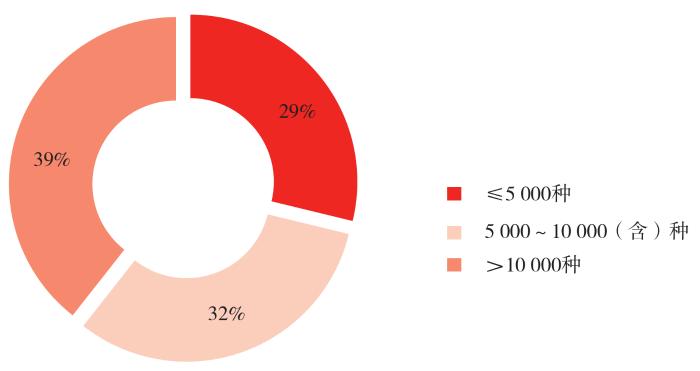从图书品种来看,店内图书超过1万种的有26家,占整个样本书店的39%(如图4所示),大都是立足于全品类经营或者人文社科大类经营的国有书店。个别专业主题经营的书店在图书选品上十分丰富,尤其是艺术类书店,如位于武汉市武昌区螃蟹岬湖北美术学院旁的视觉书屋,图书品种保持在2.1万种左右;将国内外新锐艺术家群体作为服务对象的北京三里屯PAGEONE为1.7万种,选品上以精选中文艺术类图书为主,以优秀的引进原版书为特色,配合其他类别高品质图书。图书品种在5 000~10 000(含)之间的有21家,≤5 000种的为19家,基本与书店的经营体量保持一致;一些专业性过强或只聚焦于少数群体的书店选品基本保持在两三千种左右。