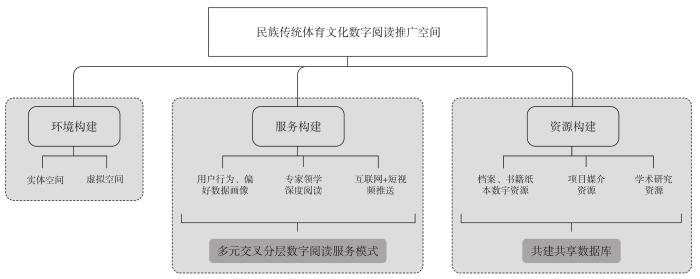 民族传统体育文化数字阅读既是一种公益性的知识传播行为,也是传播社会文化的重要手段。民族传统体育文化数字阅读推广是涉及多领域的系统工程,需要传播学、教育学、建筑学等学科领域的知识。本研究结合环境、服务、资源三要素提出构建民族传统体育文化数字阅读推广空间的路径,如图1所示。