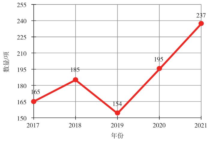2017—2021年,外译项目立项总量达936项,各年的立项数量分布如图4所示。五年来,立项数量除2019年有所回落外,总体呈上升趋势。其中,2019—2021年立项数量直线上升,2021年突破200项,达到自2010年外译项目实施以来的最高值。