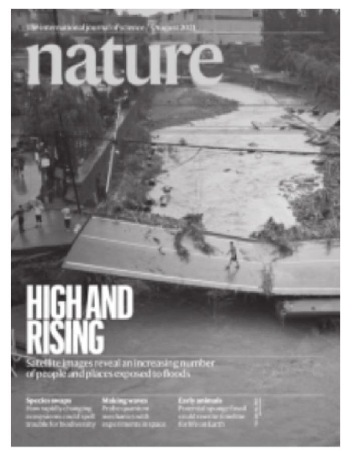 设计的意义在于更好地讲述“故事”,封面设计首先要契合文本内容,传达主题思想。Nature每期封面图像都向读者直观展示当期的重点研究文章。Nature 2018年5月17日刊发重点研究文章How To Grow A Healthy Lab,文章探究工作环境如何影响研究质量与士气的问题,分析实验室如何成为最佳工作场所,该期封面以卡通插画的形式勾勒出苹果样式的实验室外形,寓意健康工作环境的营造,内部则是虚拟的实验室场景及操作各式实验的科学家们,如图1所示,从图像形式到内容都充分展现了研究内容,趣味新颖;Nature 2021年8月5日刊发的头条文章High And Rising,内容是某科学家及其团队基于卫星图像与人口数据开发了全球洪水数据库,预计2030年前后至少有57个国家将遭受洪水的袭击,该期封面选用来自《中国日报》的一幅洪水泛滥及被冲击下的断裂路面的摄影作品,如图2所示