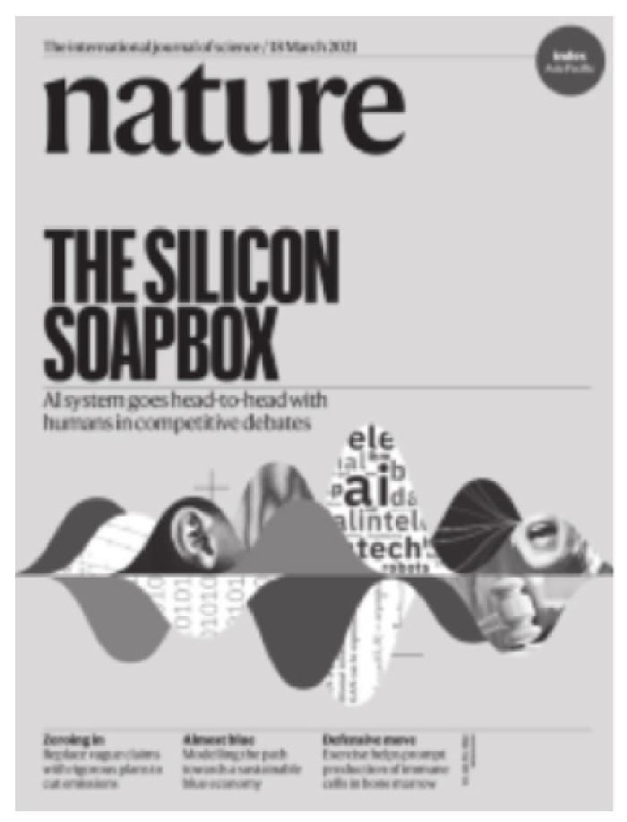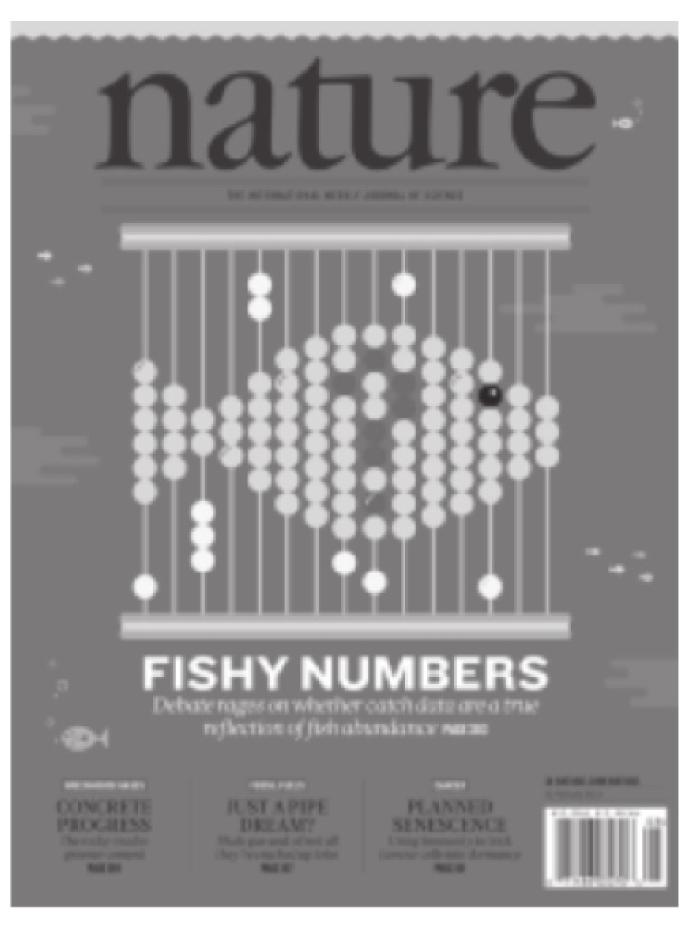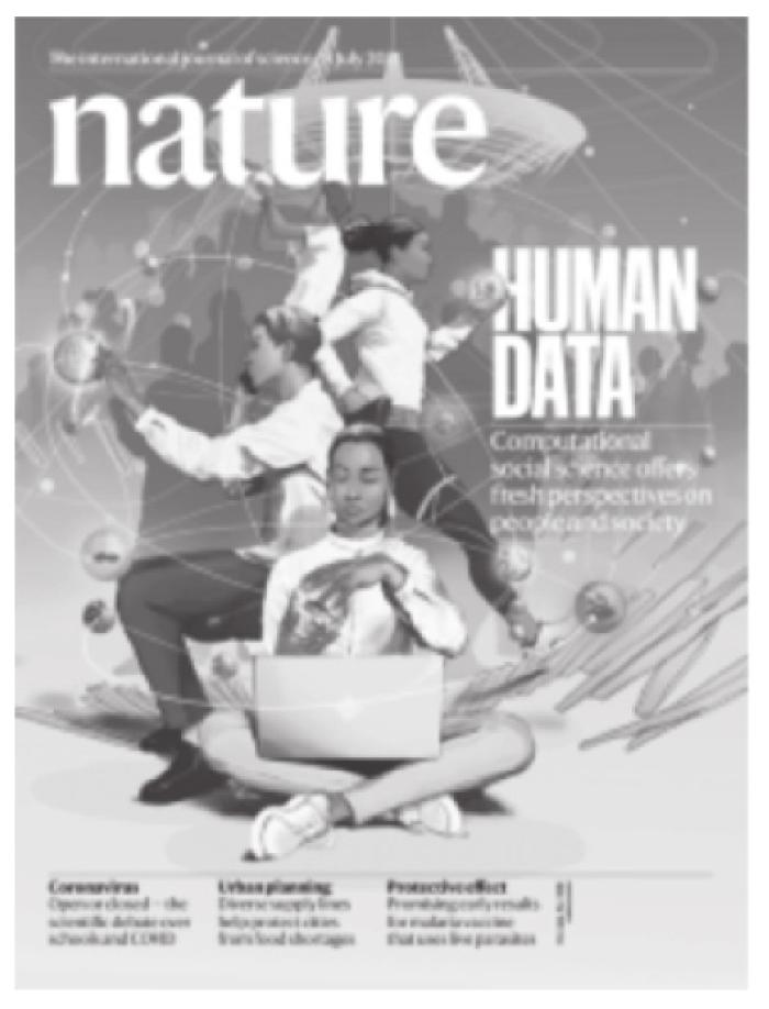 Nature的封面图像表达形式不拘一“格”。为更好展示研究内容,Nature往往通过摄影图片、手绘漫画、图形设计、显微镜像等多种视觉形式讲述科学“故事”,富有表意性与观赏性。例如,Nature 2013年2月21日刊发题为Fishy Numbers的头条文章,围绕渔民每年捕获的鱼量是否可被用作评估当年渔业健康状态的指标而展开,有的研究者认为渔获量是许多渔业指标的唯一可用数据,有的研究者则认为仅凭渔获量数据不足以支撑结论。针对这一“争论”,该期封面设计可谓独具匠心,用类似珠算算珠串联成鱼的形状,其中镶嵌红色问号,如图3所示,直观展示“计算”科学,算珠的形象代表计算,珠子串成鱼的形象表现了研究主题,问号则代表争论、疑问,是一幅创意十足的优秀作品,在设计效果和主题提升方面为内容加分。Nature 2021年7月8日版的封面用手绘的形式创作了一组沉浸科技中的人物,每人手中拿着一个球,配合本期的研究主题Human Data,如图4所示,手绘的形式独具亲近感,拉近与读者的空间距离,加上关键词的提示,让读者通过封面即了解本期的重点研究内容。