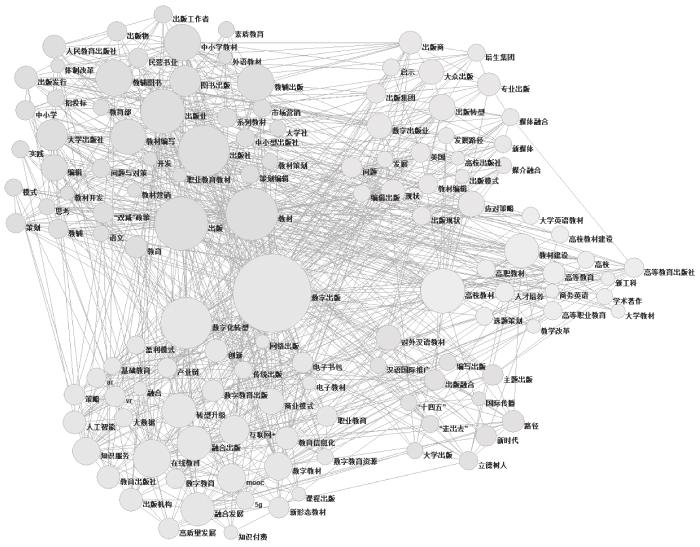 高频关键词的共现与聚类分析能够有效揭示某一领域的知识结构,反映已经形成的热点研究议题。[10]本文借助复杂网络分析工具Pajek对1 382篇教育出版研究文献中频次排名前200的高频关键词进行了主题挖掘与可视化呈现。如图3所示,每个节点都代表一个关键词,节点的大小与关键词的频次正相关,能够反映研究者关注的焦点议题;节点之间的连线表示关键词之间的共现关系,连线越多,关键词之间的共现程度越高。其中,我国教育出版研究主题网络的度中心性(degree centrality)达到0.53,表明各类主题的向心性较佳,聚集形成了部分核心研究议题;而其接近中心性(closeness centrality)和中介中心性(betweenness centrality)分别为0.49和0.20,表明各类议题之间的直接关联程度也较好,对整个网络的影响程度较高。