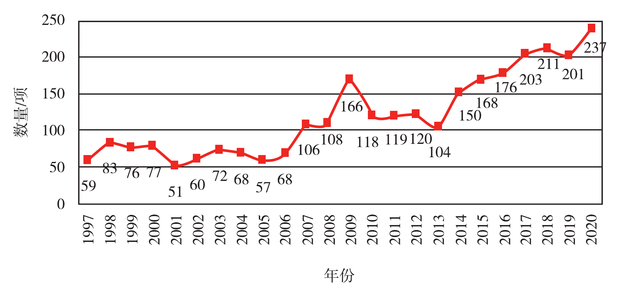 1997—2020年出版基金资助数量情况