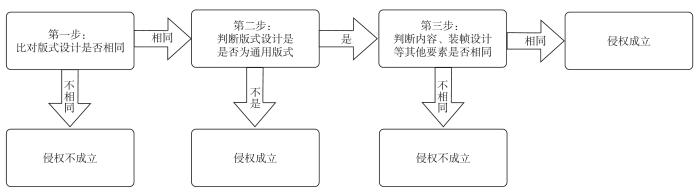 通过创新裁判方法,或许可以缓和这一矛盾。为此,本文特提出“三步判定法”的裁判方法,以帮助法院在司法裁判过程中更好地保障出版者权益,如图4所示。具言之,“三步判定法”有以下三个步骤。第一步,比对版式设计是否相同。将比对版式设计作为第一步有两个原因:①版式设计是此类侵权案件的核心要素,理应最先关注;②在不相同的情况下,可以一步得出侵权不成立的裁判结果,提高审判效率。第二步,在版式设计相同的情况下,判断该版式设计是否为通用版式。将通用版式的判断设置为第二步,也有两个方面的原因:一是虽然版式设计相同,但出版者无权禁止他人通过自己的劳动,使用相同的通用版式制作出版物,因此需要加以单独判断。二是若不构成通用版式,且该版式具有足够的辨识度,则通过两步即得出不侵权的裁判结果,无须再进行第三步判定。第三步,在构成通用版式的情况下,判定内容、装帧设计等其他要素是否相同。设置第三步的原因在于,虽然版式设计侵权的结果表现为版面布局基本相同,但版式设计侵权的认定核心却在于被诉侵权人是否未经许可直接复制了原告的版式。在构成通用版式的情况下,版式设计基本相同也可能是后出版者自身排版的结果,而非盗用他人。但需要强调的是,此处比对出版物内容、装帧设计等其他要素的目的,是用来辅助判断被诉侵权人是否实施了复制版式设计的行为,而非版式设计包含这些要素。如此,既可以避免出版者自身因使用通用版式排版而被误认为侵权,又可以最大限度地保护出版者对出版物的控制。