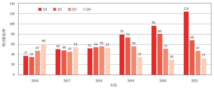 从影响因子的学科分区来看,JCR-2021中国大陆期刊位列Q1区的期刊数量相比2020年的96种上升至124种,占总数273种的45.4%,其原因一方面是2021年首次获得影响因子的16种期刊影响因子全部处于相应学科的Q1区,另一方面不少期刊的影响因子排名和学科位次继续提升;Q2区期刊68种,占总数273种的24.9%。2016—2021年JCR中国大陆期刊的学科分区情况如图1所示,中国大陆期刊JCR分区提升快速,在Q1区的占比稳步增长。