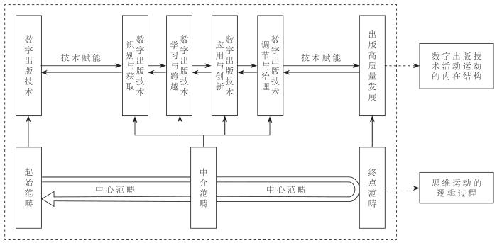 坚持从抽象到具体的原则。辩证思维的发展总是经历着从简单到复杂、从低级到高级、从片面到全面的过程,也是从抽象到具体的过程。可以说,从抽象到具体的过程是一个对象的规定性不断增加的过程,也是“思维用来掌握具体并把它当作一个精神上的具体再现出来的方式,但绝不是具体本身的产生过程”[7]103,是构筑任何理论体系和范畴体系的必循准则之一。而从数字出版技术的抽象上升到具体,则是要通过分别确定数字出版技术各方面、各部分、各层次和各关系的基本规定性,在揭示其内在联结的基础上将这些要素及其结构有机地整合为一个思维整体。在本文中,即是围绕中心范畴,以起始范畴为开端,经过中介范畴结果范畴并到达终点范畴的一个从抽象上升到具体的逻辑展开过程。