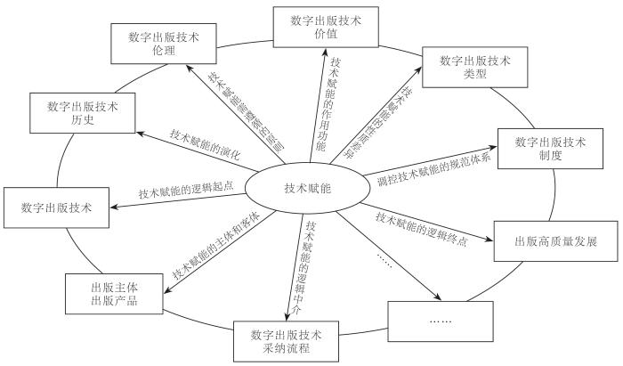 数字出版技术的中心范畴,是数字出版技术范畴体系的精神所在、灵魂所在,是贯穿于数字出版范畴体系的逻辑主线,好比把数字出版技术理论珍珠串起来的珍珠线。基于初始范畴和中心范畴之间反映着存在与本质、实体和根据、前提与结论的关系[17],数字出版技术范畴体系的中心范畴可推演为“技术赋能”:其一,存在与本质。数字出版技术作为一种嵌于社会文化、经济系统中的一部分,其自身的存在性自然无须再自证。而数字出版技术的本质是实现出版及出版活动解蔽及展现的方式,是认识、理解并改造出版的人的本质力量的体现,也是数字化逻辑和技术价值理性在出版领域渗透和扩展的具体体现,其对出版及出版活动的解蔽、展现、认知、理解、改造、渗透和扩展便是技术赋能的主要表现,由此形成存在与本质的映射关系。其二,实体和根据。若将数字出版技术视为出版活动的一项重要支撑载体、实体,确定数字出版技术发挥效用的坐标系则为技术赋能,这意味着技术赋能是整个出版活动运转的有力推动依据,由此形成了实体和依据的关系。其三,前提与结论。在数字出版技术范畴体系中,数字出版技术是起始范畴,是前提,而技术赋能是数字出版技术得以应用与推广的结果。没有数字出版技术,数字出版技术的技术赋能自然也无从谈起。