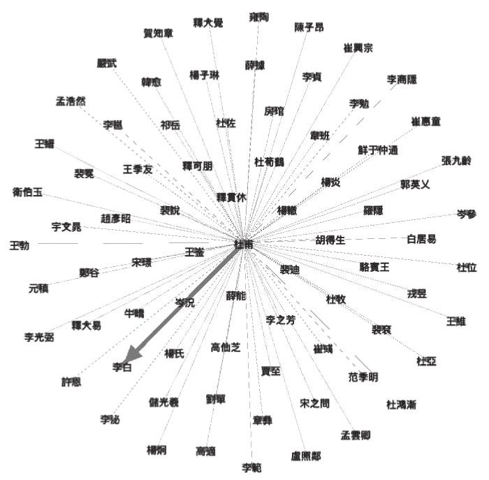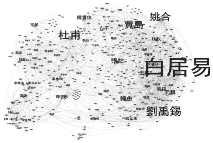 “数字古籍”为当下古籍获取、阅读和研究提供了诸多裨益。2022年4月,中共中央办公厅、国务院办公厅联合印发《关于推进新时代古籍工作的意见》,针对新机遇之下如何创造式地赋予古籍和中华传统文化“现代性”,明确提出要加快古籍资源转化利用、统筹实施国家古籍数字化工程,在国家文化大数据的体系下加强古籍资源和平台的开放共享,加快专业数据库的建设与升级。对此有学者提出加强古籍的文化传播力,开发跨媒介IP,实现多介质传播和意义再生产。[20]借助数字人文技术对文本数据分析穿透了文献本身,对经典化的文学史进行多维度的检索与考察,即是古籍“再生产”的重要成果。探究文人与文人、文人与社会的隐含信息,既能对文人群体展开研究,又能对某些个体文人进行全面分析,在面对复杂繁多的原始文献与人物关系时,凸显了文人社交网络中的共性与个性,并对文学史中的边缘人物和无名小卒进行再挖掘和再梳理,常使过去不曾被重视的文学现象得以浮出历史表层,订补过往研究中的缺漏,推进文学研究的深度。