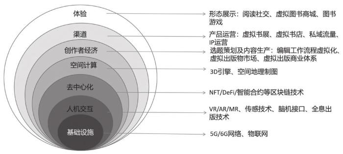 5G/6G网络、物联网等是构建出版元宇宙的基础设施,高速高效的数字网络是必要前提;借助VR/AR/MR可视化设备、传感技术、脑机接口、全息技术等,能够实现出版元宇宙的人机交互,低延时交互是高品质消费体验的关键;利用NFT(Non-Fungible Token,非同质化代币)、DeFi(Decentralized Finance,去中心化金融)、智能合约等区块链技术建立出版商业体系的去中心化交易网络,为安全高效的市场交易行为提供有力保障;应用3D引擎和空间地理制图技术等空间技术构建虚拟出版空间,如虚拟书展、虚拟书店,在这类出版元宇宙空间中,消费者借助人机交互技术进行全天候沉浸式的漫游、阅读、消费等相关活动。