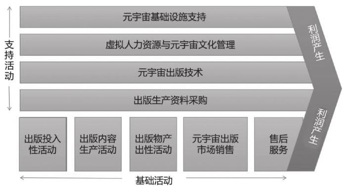 依据价值链理论,元宇宙时代出版产业的支持活动主要包括:元宇宙基础设施支持、虚拟人力资源与元宇宙文化管理、元宇宙出版技术、出版生产资料采购。元宇宙时代出版产业的基础活动主要包括:出版投入性活动、出版内容生产活动、出版物产出性活动、元宇宙出版市场销售、售后服务。元宇宙时代出版行业的支持活动和基础活动共同为利润产生贡献力量。元宇宙时代出版业价值链如图2所示。