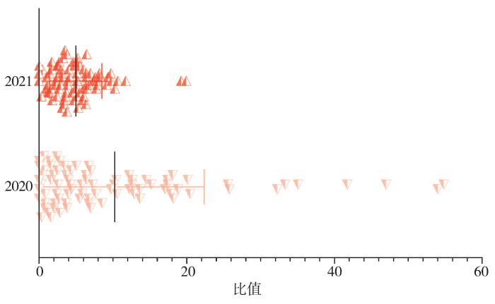 研究首先分析期刊在2020年与2021年发表的Covid-19相关文献情况,结果显示在2020年仅9本期刊没有发表过Covid-19相关论文和综述,24%的期刊Covid-19相关文献占比在20%以上,51%的期刊占比在10%以上;而在2021年各期刊发表的Covid-19相关论文和综述在数量和占比上均显著提升,仅4本期刊没有发表过Covid-19相关文献。虽然大多数期刊Covid-19相关论文和综述占比在20%以下,但是这一小部分文章为期刊贡献了绝大多数的被引频次。图1显示了发表过Covid-19相关文献的期刊在2020年和2021年Covid-19相关论文和综述与非Covid-19相关论文和综述即年篇均被引的比值,在2020年这一比值普遍达到了2以上,最高甚至达到了55;在2021年这一值显著低于2020年,不过93%期刊这一比值仍然高于1,82%期刊这一比值高于2,可以看出Covid-19相关文献的引用水平远超其他文献。Covid-19非论文和综述类型的文献也是类似,对53本两年均发表过10篇以上Covid-19非论文和综述的期刊进行分析,2020年Covid-19非论文和综述文献平均占比为28%(占所有非论文和综述类型文献的比例,下同),2021年这一比例达到35%,其Covid-19相关文献与非Covid-19相关文献被引频次比值最高达到85。