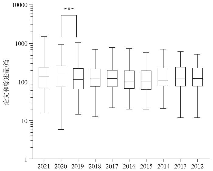 图2显示了2012—2021年传染病学领域期刊每年发表的论文和综述数量,对相邻年份期刊论文和综述数量使用Wilcoxon符号秩检验,结果显示仅2020年期刊载文量显著高于2019年,其他年份间均无显著差异,疫情一定程度上影响了期刊出版工作,2012年到2019年间平均发文量一直维持在166篇左右,而在2020年均值达到了204篇,2021年达到了219篇。