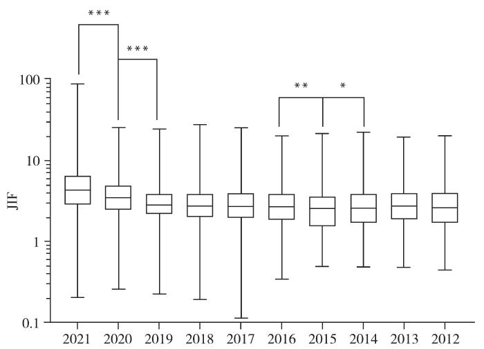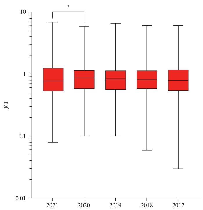 以JCR中传染病学领域期刊作为研究对象,2021年JCR收录传染病学领域期刊95种,其中Medecine ET Maladies Infectieuses在2021年更名为Infectious Diseases Now,因此合并两个刊数据,最终研究94种期刊。从JCR中获取94种期刊2012—2021年间的影响因子(JIF)、载文量(Citable Items)及期刊引文指标(JCI),如果当年指标为空,则记为缺省值,其中JCI只有2017—2021年5年数据。通过Web of Science收集2019年和2020年各期刊每年发表的论文和综述数量及其他类型的文献数量;并通过引文报告,获得两种类型文献在发表后每年分别获得的被引频次。研究还通过限定Publication/Source Titles,使用检索词(Topic = covid-19 or sars-cov-2 or novel coronavirus)来筛选其中与新冠肺炎疫情相关的文献,收集2020年和2021年各刊发表的相关文献数量,以及在发表后每年获得的被引频次,以上数据于2022年7月31日收集。期刊文献学科排名百分位数于2023年3月2日使用InCites数据库收集。研究中使用的差异性检验均为非参数检验方法,因为引文指标普遍不符合正态分布,对不同年份间的指标差异使用Wilcoxon符号秩检验,而相关性检验则使用Spearman相关性分析,以上均使用IBM SPSS Statistics 22完成,绘图使用Excel和GraphPad Prism 8完成。